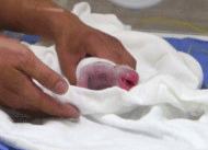 | 昨天一早,台北动物园就在大熊猫馆内贴出告示:“圆圆于7月6日20时05分产仔(崽),圆圆做(坐)月子即日起停展,敬请来宾见谅与祝福。”而从台北动物园已经公布的影片看,熊猫幼崽全身呈肉粉色,没有耳朵,眼睛的部位也只是一个黑点儿。总体长21.3厘米、183.4克重的雌性熊猫幼崽,看起来十分娇小,外形类似刚出生的兔子。
