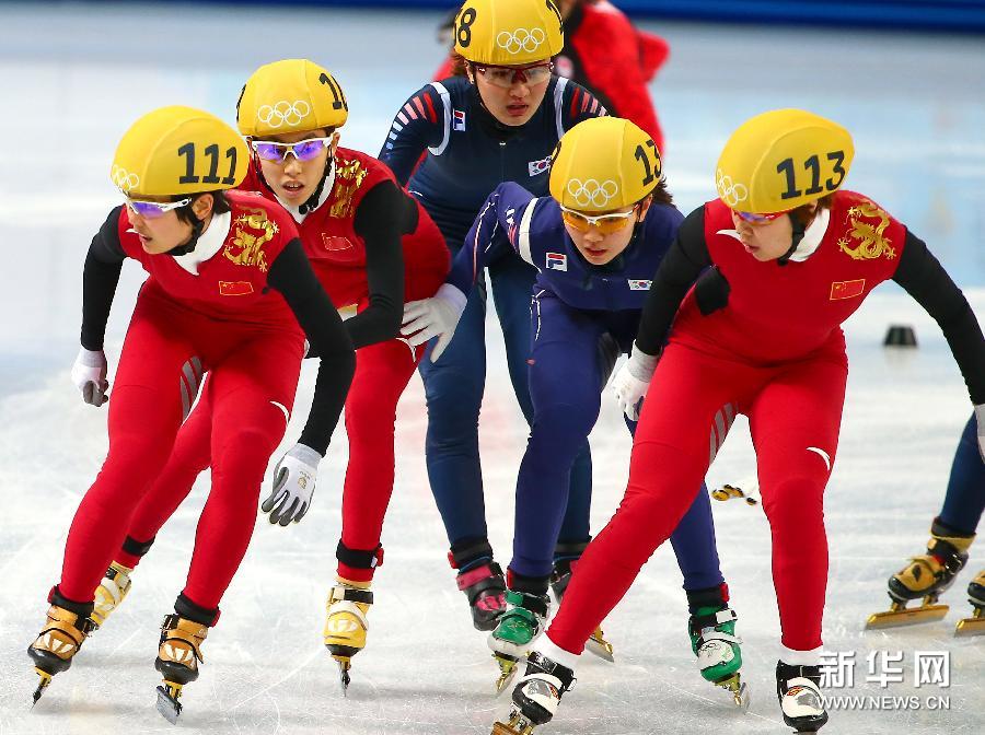 2月18日,中国队队员周洋(右一)在比赛中阻挡韩国队队员沈石溪(右二)。当日,在索契冬奥会短道速滑女子3000米接力决赛中,中国队第二个冲过终点;但因队员周洋在比赛中阻挡韩国队队员沈石溪的前进路线,赛后中国队被裁判取消成绩。 新华社记者龚兵摄