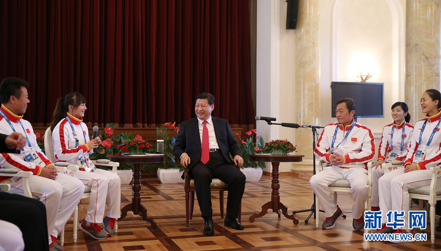 2月7日,中共中央总书记、国家主席、中央军委主席习近平在俄罗斯索契亲切看望参加第二十二届冬季奥林匹克运动会的中国体育代表团。这是习近平在座谈会上与代表团成员亲切交流。新华社记者 兰红光 摄