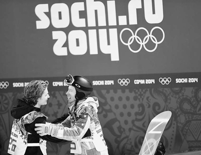 2月11日,肖恩·怀特(右)在比赛后与冠军波德拉奇科夫相互致意。新华社记者 李 钢摄