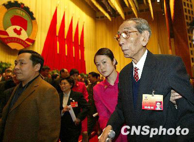 图为2004年3月12日,全国政协十届二次会议在北京人民大会堂闭幕,全国政协副主席阿沛·阿旺晋美出席。中新社发 满会乔 摄