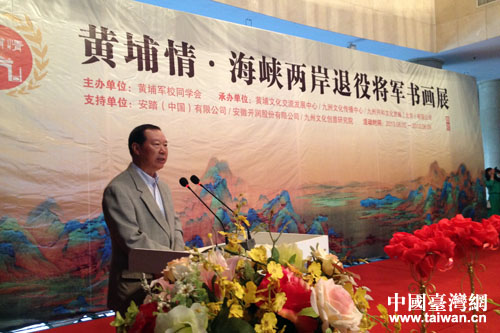黄埔情·海峡两岸退役将军书画展5日上午在青岛博物馆开幕,原海协会副会长、“黄埔情”系列活动组委会顾问王在希代表组委会致辞。(中国台湾网 张洁 摄)