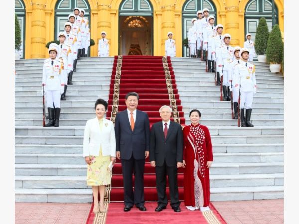 11月5日,中共中央总书记、国家主席习近平在河内同越共中央总书记阮富仲举行会谈。这是会谈前,习近平出席阮富仲在主席府广场举行的盛大欢迎仪式。新华社记者兰红光摄