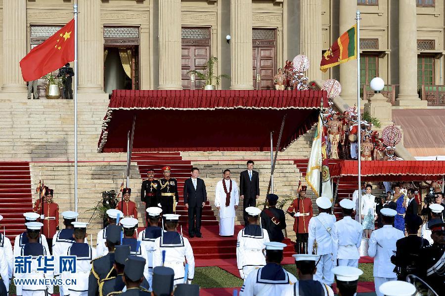 9月16日,斯里兰卡总统拉贾帕克萨在科伦坡为国家主席习近平举行盛大欢迎仪式。 新华社记者李涛摄 图片来源:新华网