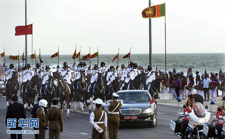 9月16日,斯里兰卡总统拉贾帕克萨在科伦坡为国家主席习近平举行盛大欢迎仪式。这是习近平和夫人彭丽媛乘坐的专车在摩托车队和骑兵队护卫下驶入欢迎仪式现场。新华社记者李涛摄 图片来源:新华网