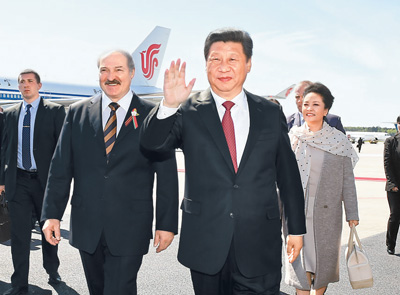 5月10日,国家主席习近平抵达白俄罗斯首都明斯克,开始对白俄罗斯进行国事访问。白俄罗斯总统卢卡申科偕白俄罗斯政府高级官员到机场迎接习近平和夫人彭丽媛。