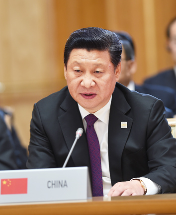 在讨论金砖国家合作议题时,习近平指出,各方要落实金砖国家新开发银行和应急储备安排等重大成果倡议,彰显金砖国家执行力。要规划重点合作领域,加强金砖国家经济伙伴战略同各成员发展规划对接,增强金砖国家向心力。要发掘各自优势和潜力,开展创新合作和产能合作,加强金砖国家竞争力。要追求人类公平正义和全球关系民主化,坚持共同而有区别的责任原则,支持联合国制定可持续发展目标,增进人类福祉,从而提升金砖国家感召力。