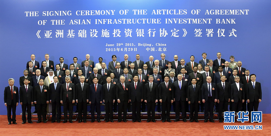 6月29日,国家主席习近平在北京人民大会堂会见出席《亚洲基础设施投资银行协定》签署仪式的各国代表团团长。 新华社记者 兰红光 摄