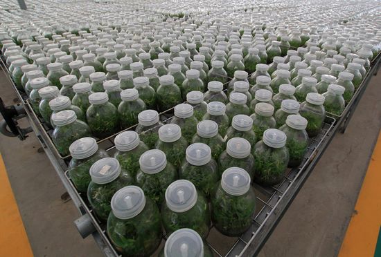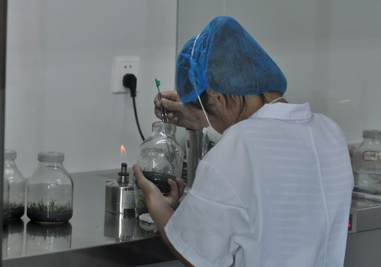 走进六安安徽圣农生物科技股份有限公司石斛培育基地,眼前一瓶瓶长满绿色小苗的植物立即吸引了记者的目光。“这就是我们培育出来的霍山石斛小苗!”该公司董事长拿出一个瓶子,里面密密麻麻长着无数颗像草芽一样的细小植物。“瓶壁上的每一个细小微粒,都可以长出一颗米斛来。”他告诉记者,他们采用的这种技术叫“植物组织培养”,其实就是植物“克隆”,即利用植物的体细胞进行分裂培育,来孕育新生命。