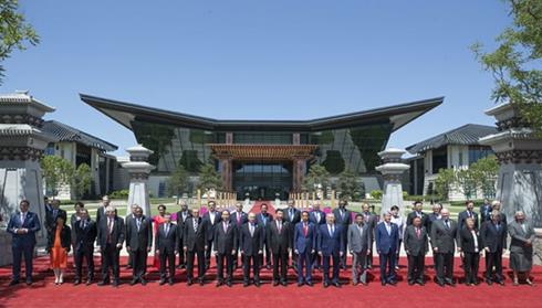 5月15日,“一带一路”国际合作高峰论坛在北京雁栖湖国际会议中心举行圆桌峰会,国家主席习近平主持会议并致辞。这是当天中午,习近平同与会领导人和国际组织负责人以国际会议中心“汉唐飞扬”主建筑为背景集体合影。(来源:新华网)