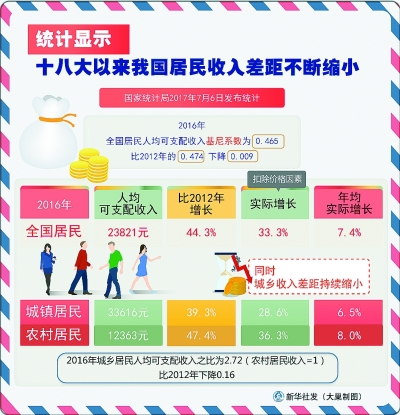 例如,在上世纪90年代和21世纪第一个十年,工资提高和居民收入增长滞后于劳动生产率的提高,其中农民收入增长的滞后程度更为明显,造成这一时期城乡收入差距扩大、居民收入基尼系数上升以及劳动报酬在国民收入中的份额下降等不利于收入分配改善的结果。在此之后,城乡居民收入增长实现了与劳动生产率提高的同步,甚至一些群体的收入还略快于劳动生产率提高速度。相应地,收入分配状况也开始得到改善。2016年,城乡收入差距缩小到2.36,基尼系数下降为0.465。