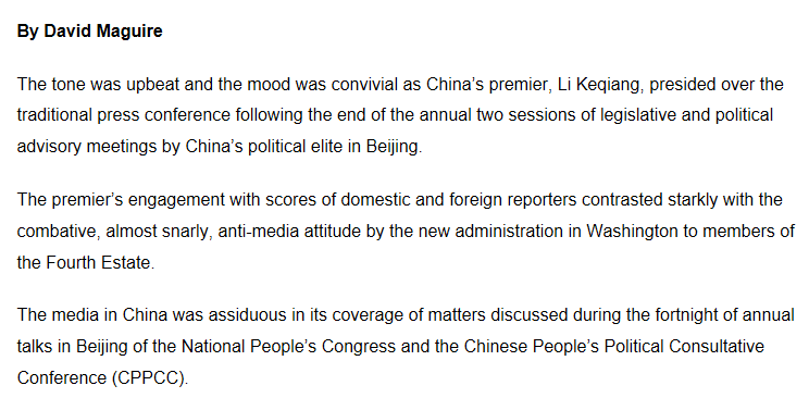 穿着深色西服打着柔和的蓝色领带,李总理在人民大会堂上演了又一场精彩的记者答问会。他亲切地对用中文提问的外国记者说“你的普通话很好啊”,“你有很大的勇气用中文表达所有的问题”。李总理对中外媒体记者亲切和蔼的态度与新一届美国政府对媒体不甚友善的态度形成天差地别的鲜明对比。