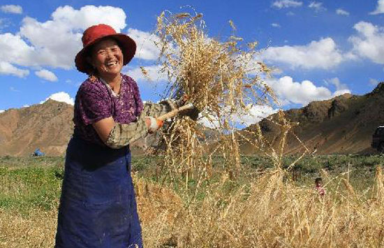 9月7日,西藏日喀则市甲措雄乡塔康村村民次白吉珍在收割青稞。