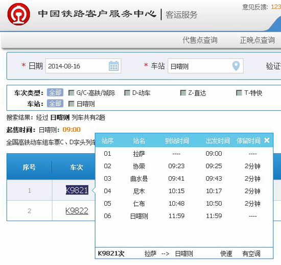 记者登录“中国铁路客户服务中心”网站发现,在“车站车次查询”功能中已经能够完整地看到拉日铁路K9821次旅客列车和K9822次旅客列车的运行时间、沿线各站停靠时间等信息,也可通过铁路官网12306订购票。
