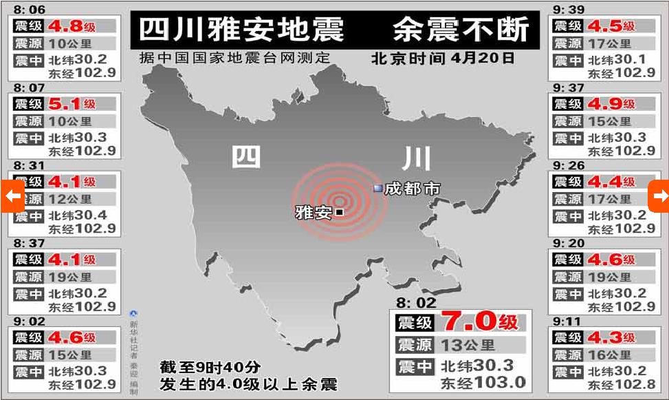 中国台湾网4月20日消息 四川雅安芦山县4月20日8:02发生7.0级地震,震源深度13公里。截止上午9:40,发生多起4.0级以上余震。(据中国国家地震台网)