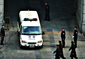23日上午8时,警车后门正对暂看室,被告人从警车后门下车直接进入暂看室。芙翰 摄