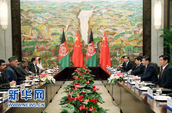 卡尔扎伊表示,阿中两国有着兄弟般深厚的友谊,中国是阿富汗信赖的好邻居。阿方感谢中方给予阿富汗和平重建的宝贵支持。无论阿富汗大选结果如何,阿方决心同中方发展亲密的睦邻友好关系,希望中方继续帮助阿富汗实现稳定、和解、发展,帮助阿富汗培训各类人才。恐怖主义、跨国犯罪是阿中两国共同的敌人,阿方愿同中方合力打击。