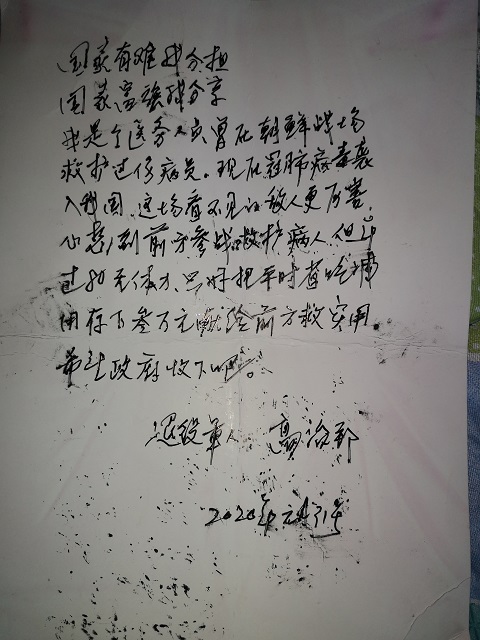 “国家有难我分担,国家富强我分享。我是一名医务人员,曾在朝鲜战场救护过伤病员。现在新型冠状病毒袭入我国,看不见的敌人更厉害,想到前方救护病人,但年过80无体力,只好把平时省吃俭用存下来的3万元献给前方救灾用,希望政府收下。”