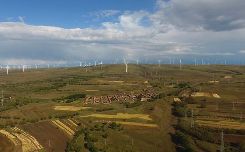 9月坝上,蓝天、草原、旋转的巨大“风车”相互映衬。这里是国家规划的9个千万千瓦级风电基地之一,将助力北京冬奥会成为“绿色冬奥”。