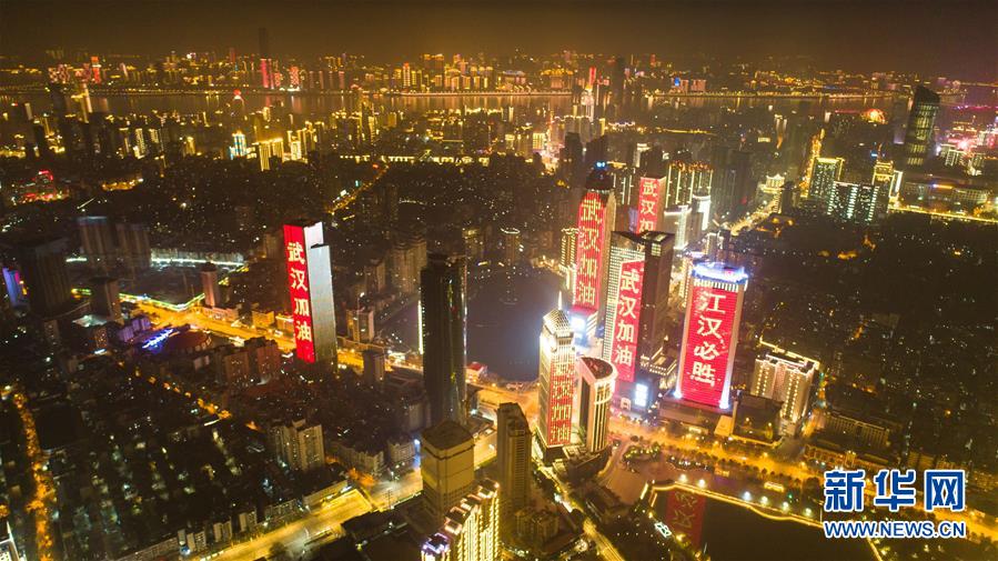 1月31日,武汉市江汉区西北湖附近高层建筑外墙打出“武汉加油”等字样(无人机照片)。 新华社记者肖艺九摄