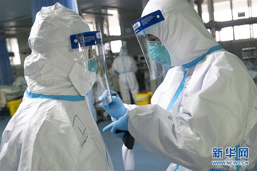 1月24日,在武汉大学中南医院重症隔离病房,医护人员在隔离服上写下名字,方便辨认。 新华社记者熊琦摄