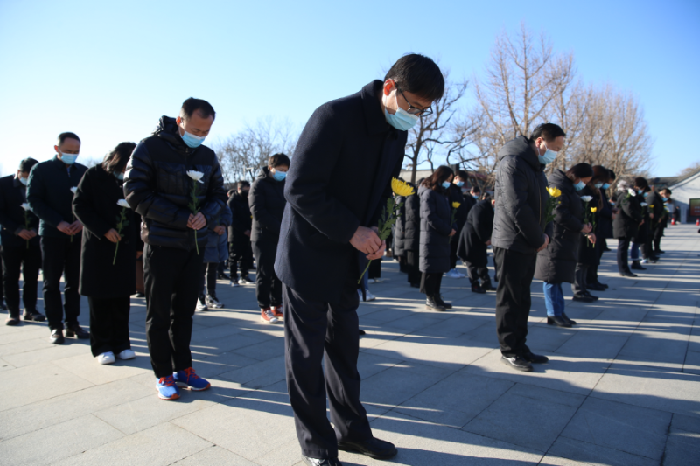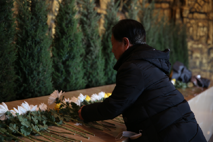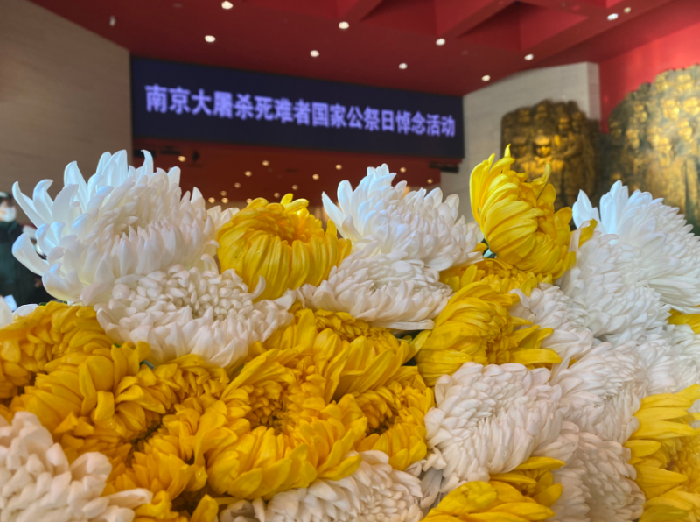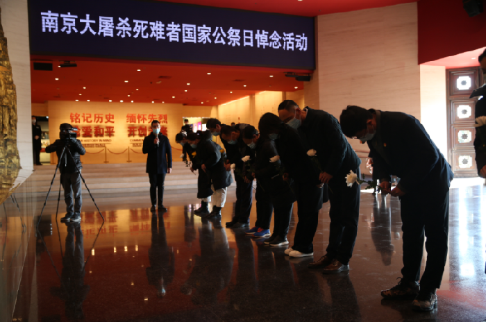 10时,《义勇军进行曲》响起,现场百余名参与仪式的活动人员高唱中华人民共和国国歌,全体人员为所有惨遭日本侵略者杀戮的死难同胞默哀。随后,他们依次将鲜花敬献于该馆序厅“铜墙铁壁”雕塑前。
