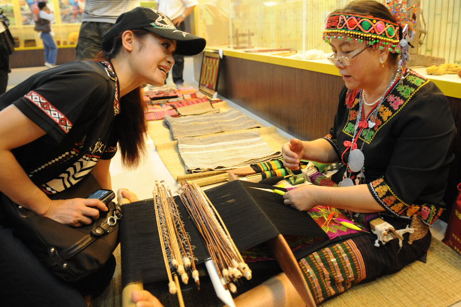 琼台少数民族妇女交流纺织技艺。(唐小平摄)
