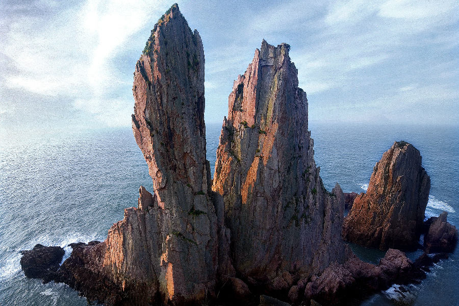甲午岩核心景区位于大陈岛东侧近岸处,系干出岩,以造型雄奇见长,素有“东海第一大盆景”之美誉。甲午岩的主体由两块长15米、宽11米的岩礁组成,其中最高的一块岩石高约35米。从甲午岩景区玻璃观景平台俯瞰两块岩石,如同两个巨人屹立在海边,任凭风吹浪打。