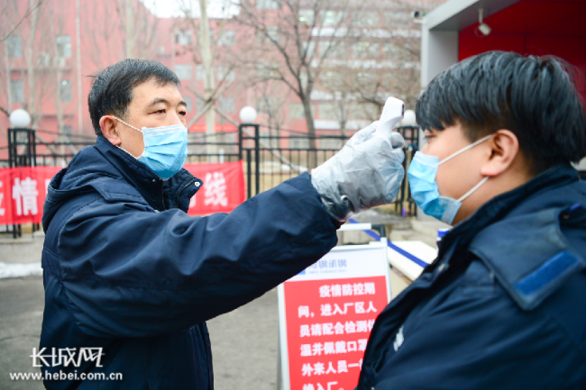 鲍守坤为入厂人员测体温。河钢集团承钢公司供图
