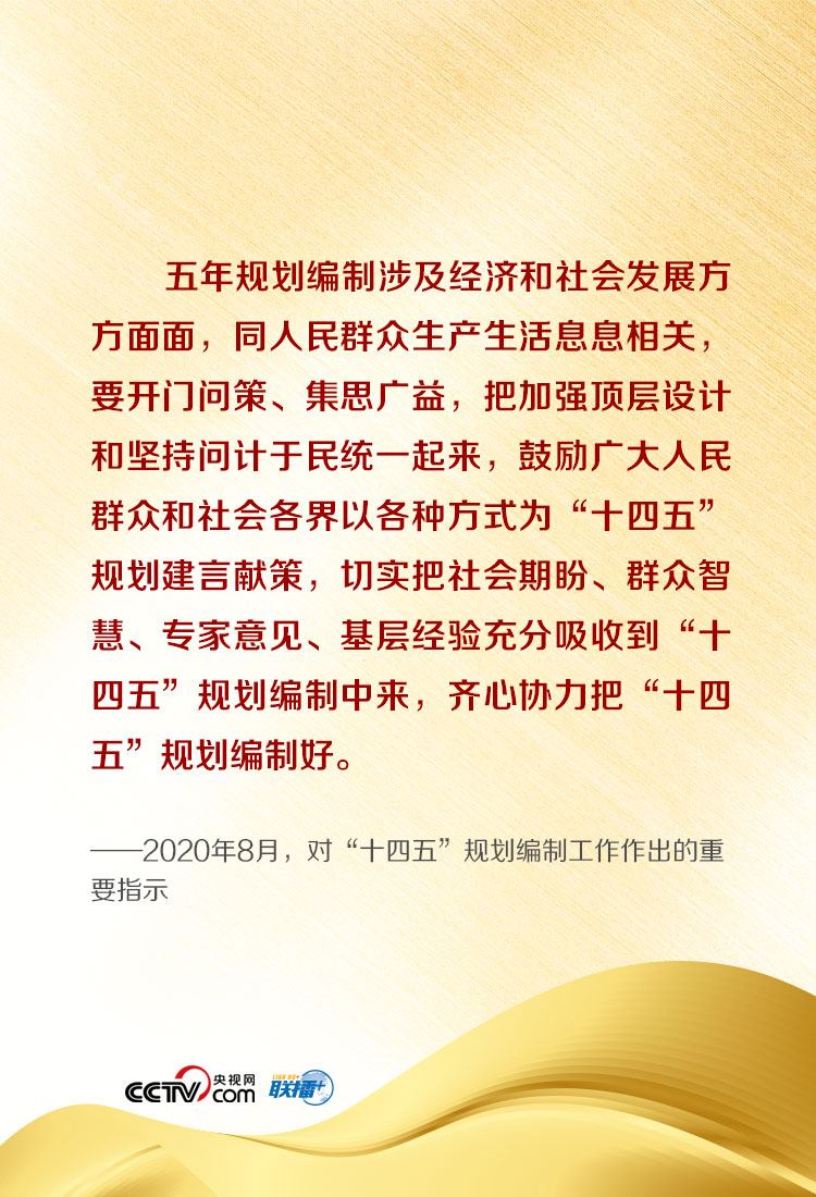 联播+ “人民对美好生活的向往就是我们的奋斗目标。好的方针政策和发展规划都应该顺应人民意愿、符合人民所思所盼,从群众中来、到群众中去。”近一个月以来,习近平总书记多次主持召开各领域专家座谈会,开门问策,切实把社会期盼、群众智慧、专家意见、基层经验充分吸收到“十四五”规划编制中来。
