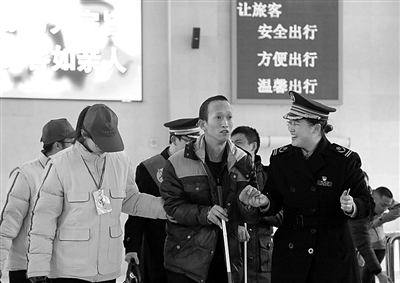 图为青岛站值班主任孙梅(右一)和志愿者帮助王富(中)进站。