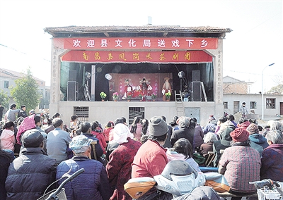 江西南昌县文化广播电视旅游局组织凤岗采茶剧团来到武阳镇前进村,为村民送上了精彩的演出。 胡敏华摄