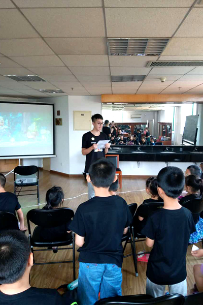 台湾学生吕雨樵在为小朋友讲解注意事项。