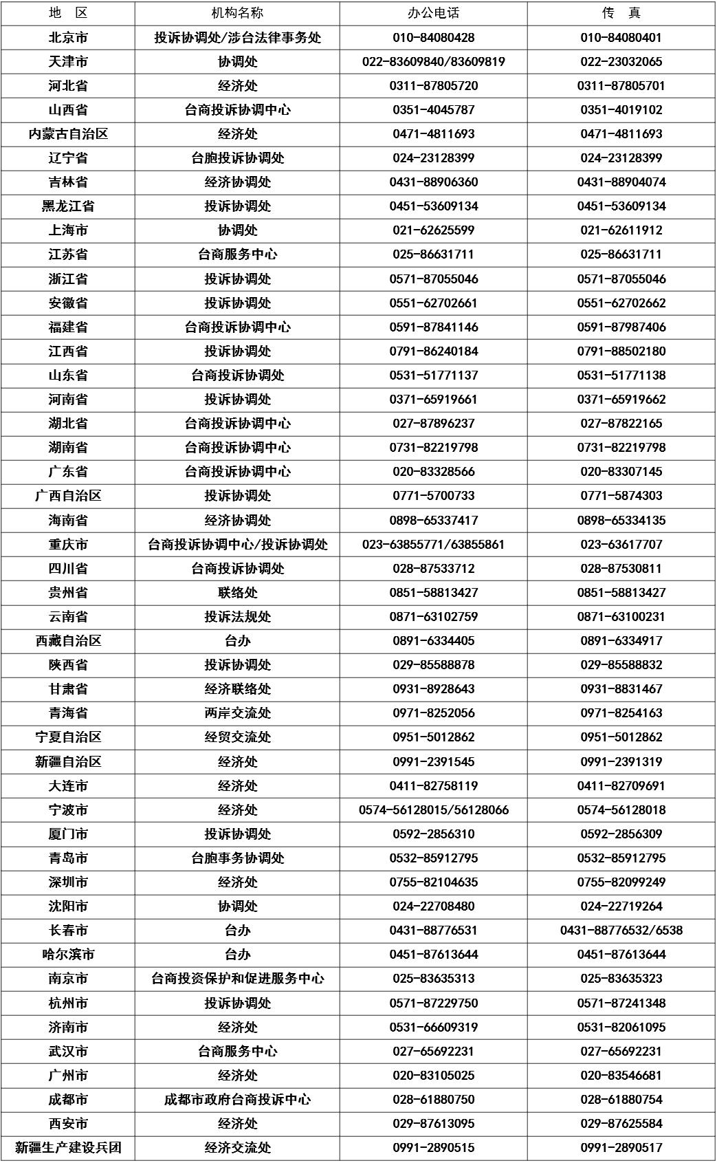 各省、自治区、直辖市及部分副省级以上城市台胞权益保障机构及联系方式