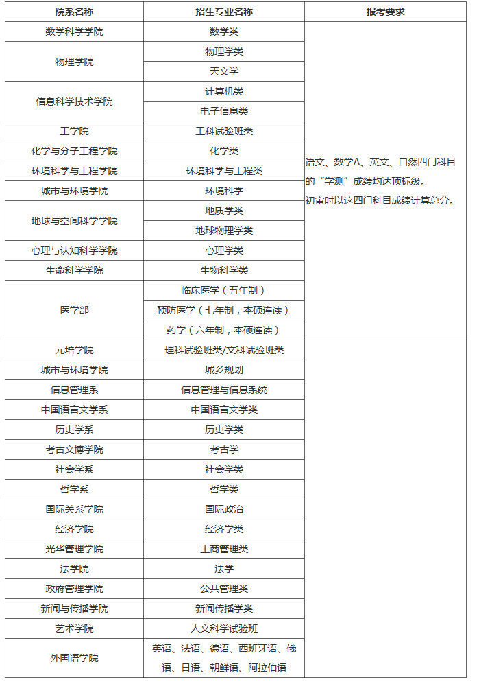 2、凡所报专业志愿中包含数学类、物理学类、天文学、计算机类、电子信息类、工科试验班类、化学类、环境科学与工程类、环境科学、地质学类、地球物理学类、心理学类、生物科学类、临床医学、预防医学或药学之一的考生,初审时以语文、数学A、英文、自然四门科目成绩计算总分。