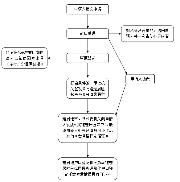 答:公安机关出入境管理机构受理申请人定居申请后,将在60个工作日内作出批准或者不批准的决定,签发《批准定居通知书》或《不批准定居通知书》,并通知申请人。公安机关出入境管理机构批准申请人定居申请后,申请人须在收到《批准定居通知书》6个月内,到申请定居的市、县公安局办理《台湾居民定居证》,申请人应上缴原持有的《台湾居民来往大陆通行证》或其他有效旅行证件、台湾身份证件和出入境证件,公安机关出具《证件收缴证明》。被批准定居的台湾居民须在《批准定居通知书》有效期内持《批准定居通知书》和《台湾居民定居证》到定居地户口登记机关办理常住户口登记手续并申领居民身份证。未在规定时限内办理落户手续的,按自动放弃定居处理。