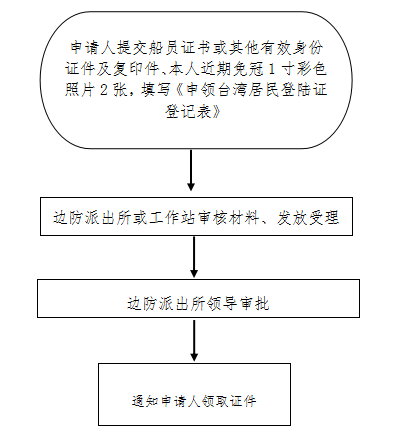 申请人填写《申领台湾居民登陆证申请表》,向服务台轮停泊点边防派出所(工作站)提交相关申请材料。