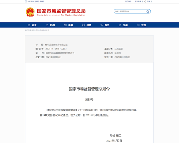 国家市场监督管理总局日前发布了《化妆品注册备案管理办法》。