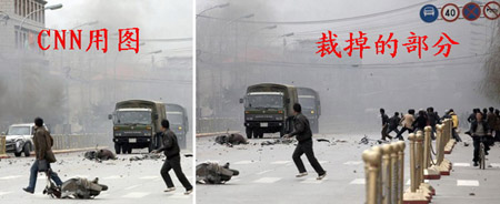引起中国网民愤慨的报道大多来自美国有线电视新闻网(CNN)、英国广播公司(BBC)以及德国《柏林晨报》等西方媒体。3月17日,BBC在其网站上刊登了一张照片,说明写的是“在拉萨有很多军队”,而画面却是中国公安武警协助医护人员将受伤人员送进救护车的场景。而在CNN网站发表的一张图片,却将反映暴徒投掷石块攻击军车的部分裁剪掉,而仅显示出军车在路上行驶,前面则有人在奔跑。这些或张冠李戴或刻意歪曲的报道,其用意不言自明。
