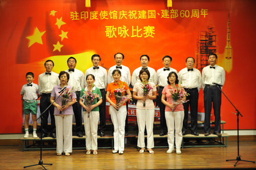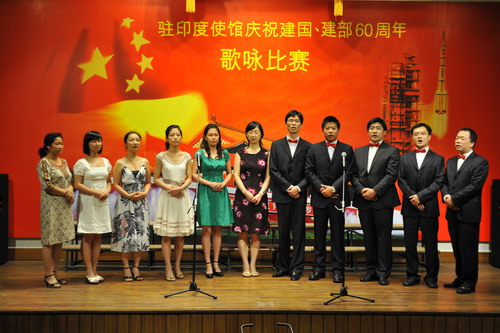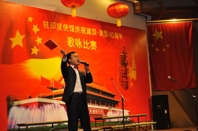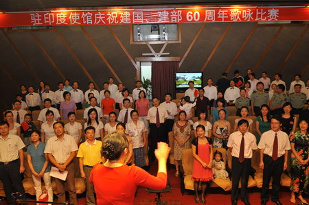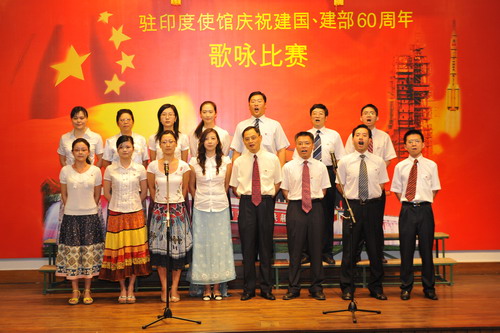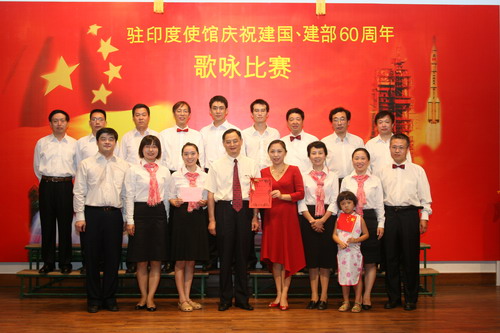 2009年9月11日,驻印度使馆在馆内举办“庆祝建国、建部60周年歌咏比赛”,张炎大使夫妇和全体馆员一起参加了比赛。