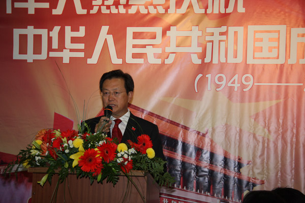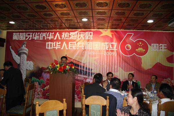 高大使在讲话中回顾了建国60年来的伟大成就,并赞扬包括旅葡华侨在内的海外华人华侨为实现祖国民族独立、国家强盛做出的特殊贡献。高大使充分肯定各侨团在帮助和团结侨胞发展事业、解决生存和发展问题,融入当地社会、保持和传播中国传统文化、促进中葡经贸往来、增进两国人民之间的了解和友谊方面发挥的积极作用,希望全体侨胞在国际金融危机中发扬中华民族勤劳智慧、吃苦耐劳的传统美德,团结一致、同心同德、奋发图强,共同开创更加美好的明天!