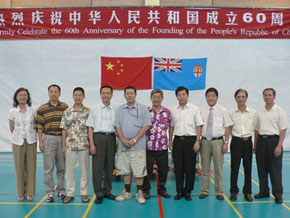 2009年9月20日上午,座落在斐济首都苏瓦的华人学校斐济逸仙学校礼堂座无虚席,600多华人华侨和中资机构代表济济一堂,出席斐济中国和平统一促进会和华人协会联合举办的庆祝中华人民共和国成立60周年升旗仪式和文体活动。活动在庄严的中斐国歌声中开始。韩志强大使及和统会会长袁炳棠和华人协会会长司徒新耀分别发表了热情洋溢的致辞。