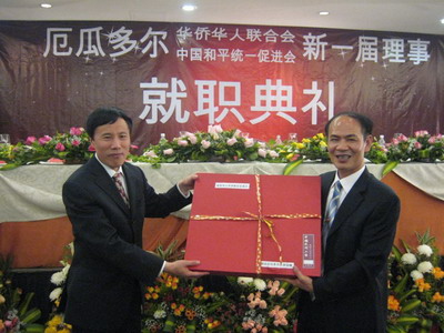 2009年5月13日晚,厄瓜多尔华侨华人联合会、中国和平统一促进会在基多举行新一届理事就职典礼,中国驻厄瓜多尔大使蔡润国及专程到访的广东省外办代表团应邀出席。