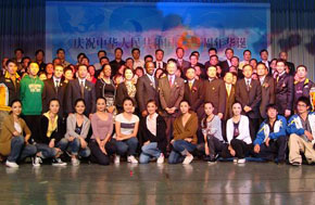 钟建华大使在演出后与演员合影 | 晚会最后是全场千人合唱《歌唱祖国》和南非反对种族隔离时期流行民歌《萧萧罗沙》。现场的南非朋友即兴登上舞台,与华侨华人一起载歌载舞,欢庆我们伟大祖国成立60周年,将晚会的气氛推向高潮,最后联欢会在雄壮的歌声中落下帷幕。