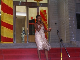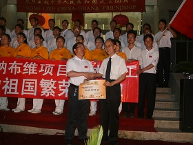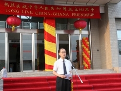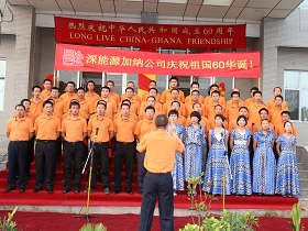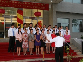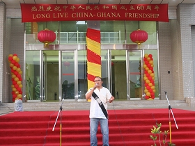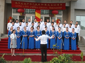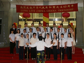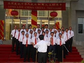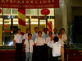 2009年9月19日,中国驻加纳大使馆院内张灯结彩,喜气洋洋。中国驻加纳使馆、中资企业加纳商会与加纳中华工商总会在这里共同举办迎国庆60周年文艺汇演,使馆、中资企业和华人华侨共400余人出席活动。