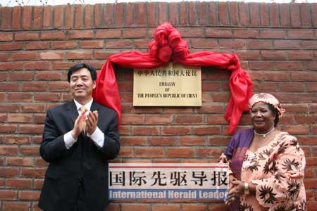 中国国家主席胡锦涛的代表、外交部长助理翟隽(左)同马拉维外长班达共同为使馆揭牌。