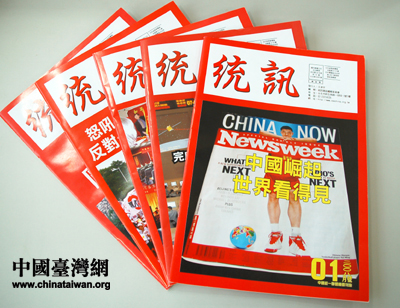 王津平向中国台湾网记者赠送的中国统一联盟机关刊物《统讯》 |