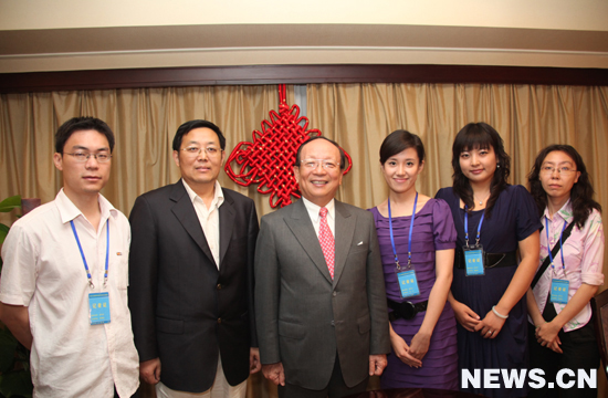 中国国民党副主席蒋孝严与新华社记者合影 新华网 邢广利 摄