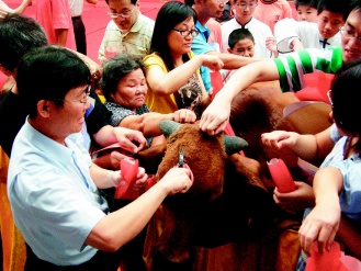 台南县祭孔最后拔智慧毛时,民众一拥而上,有名30多岁男子竟掏出小剪刀在牛头上连剪3、4次,将一撮撮牛毛放入口袋。有家长看见急着说:“智慧毛是要用拔的,孔夫子也不会认同用剪的。”另名家长说,如果不制止这种行为,以后他要将整条牛扛回家,也有人说明年带电动刮胡刀来。(高大林) |