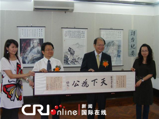 国际在线消息(驻澳门记者于晓莉):台湾孙中山纪念馆与澳门孙中山纪念馆合办的“‘孙中山与台湾’当代名家书画图片展”6月2日在澳门孙中山纪念馆开幕。展览为期一个月,共展出作品52件。其中包括孙中山墨宝“天下为公”和“博爱”的真迹复制件。
